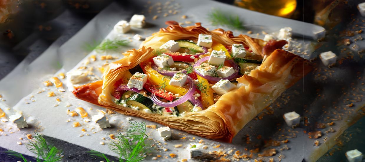 אחרי שהתנסינו כבר בשימוש בעלי פילו, הפעם נכין מהם מאפה מפנק וצבעוני – עם בצל סגול, פלפל צהוב ואדום, קישוא ושמיר ירוקים ושומר לבן, עטופים בעלי בצק פריכים ובפירורי פטה.