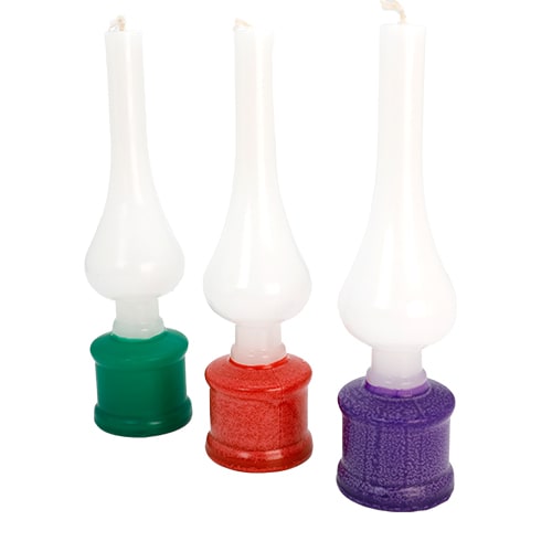 נר הבדלה מהודר, דקורטיבי וייחודי בצורת למפה עתיקה ומיוחדת בצבעים שונים סגול, אדום, ירוק, צהוב. – שלוש פתילות.