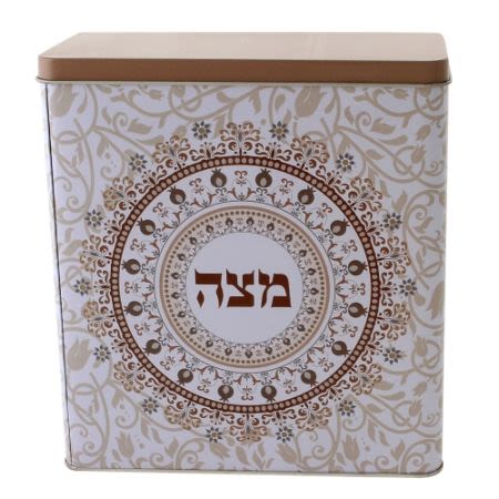 קופסה למצות יפה ומיוחדת למצות ולשמירה על טריותן, עשויה מפח בגווני חום, קרם, ולבן בעיצוב וינטאג'. גוף הקופסה - רקע בהיר עם שילוב מיוחד של עיטורים אתניים ורימונים בגווני חום, קרם ולבן. במרכז, בשני הצדדים - הכיתוב "מצה" בתוך עיגול עם רימונים ופרחים. המכסה, בצבע חום בהיר חלק. גודל 21*19 ס"מ.